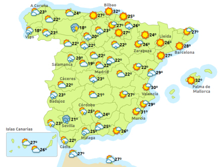 Madrid får noget skyet vejr – med lidt regn i aften med mellem 15 til 30 grader, i Barcelona ret skyet og efterhånden noget regn og 20 til 26 grader, Valencia ret skyet med regn og 22 til 30 grader, Málaga lidt overskyet med mellem 22 til 27 grader, og Palma de Mallorca får letskyet vejr og 21 til 31 grader.