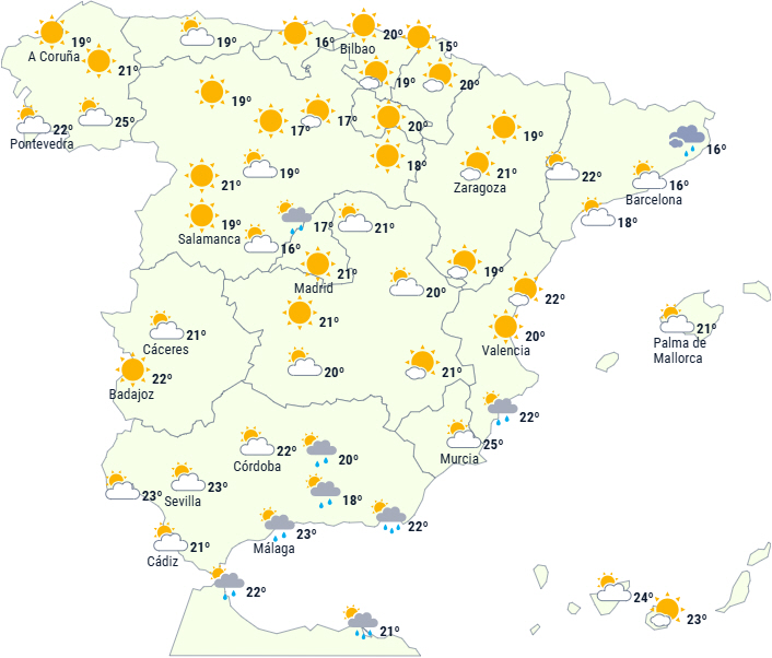 Stabilt vejr på Den Iberiske Halvø med skyet eller meget skyet himmel over den sydvestlige del i de tidlige morgentimer med svag nedbør, der aftager om formiddagen og derefter letskyet himmel.