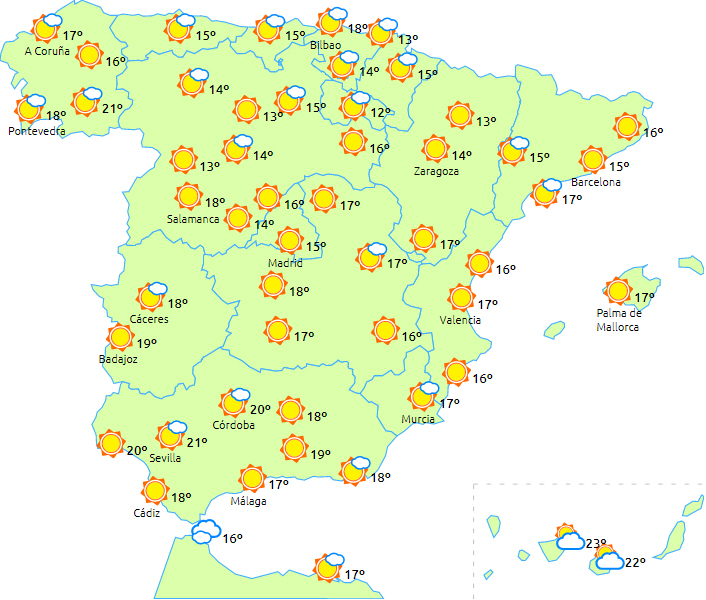 I de nordvestligste egne af De Kanariske Øer, Balearerne, den sydøstlige del af halvøen og resten af den andalusiske middelhavskyst lavthængende skyer i perioder dog efterhånden tendens til opklaring.