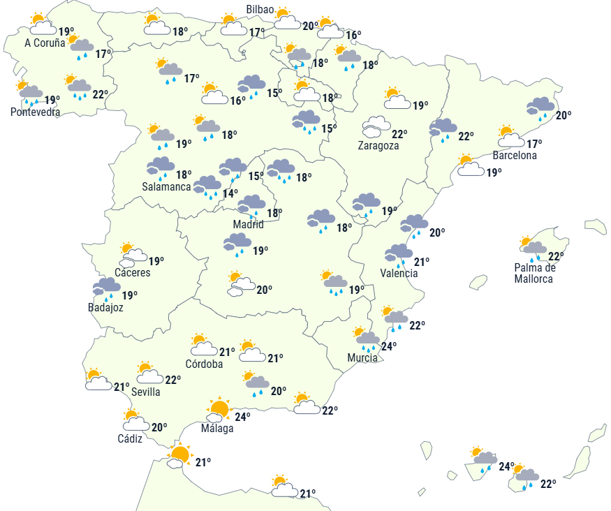 Stabilisering af vejret på halvøen og De Baleariske Øer med letskyet eller klar himmel over den nordlige del af halvøen. Over den sydlige del vil der derimod være overvejende skyet himmel i dagens første halvdel, men dog tendens til opklaring, efterhånden som dagen skrider frem.
