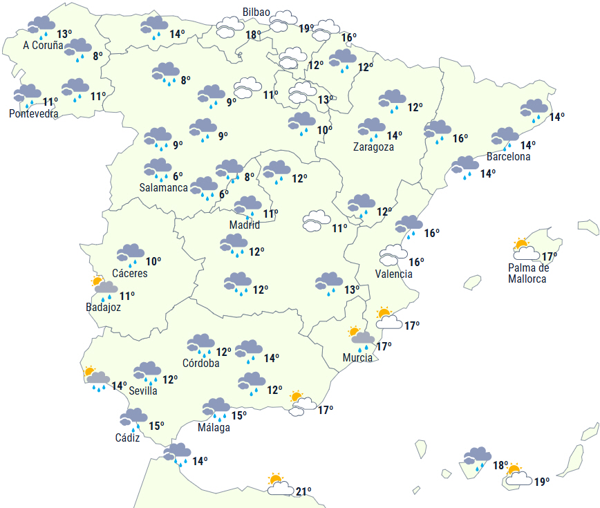 - Heldagsregn i Castellón og det østlige Catalonien samt i det vestlige Andalusien og i det vestlige Galicien og i Sistema Central.