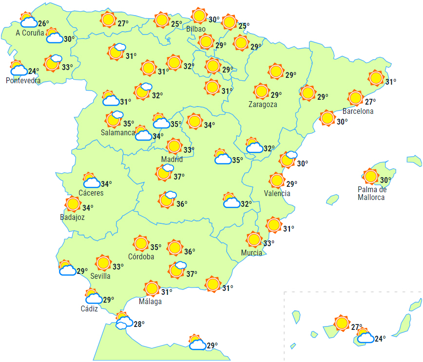 Klar himmel, bortset fra nogle perioder med mellem- og højtliggende skyer. Temperaturerne er uændrede, undtagen i de indre egne, hvor maksimumtemperaturerne vil stige. Det betyder 27 til 38 grader og 21 til 23 i nat.