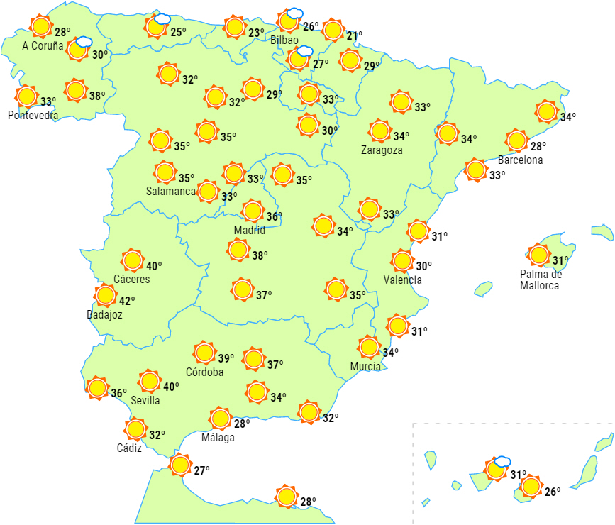 De højeste temperaturer vil stige på De Kanariske Øer, i den sydvestlige del af Andalusien og i en stor del af midten og nord for halvøen. De vil være over 35 grader i det indre af halvøens sydvestlige kvadrant og sandsynligvis også i det indre af det sydlige Galicien.