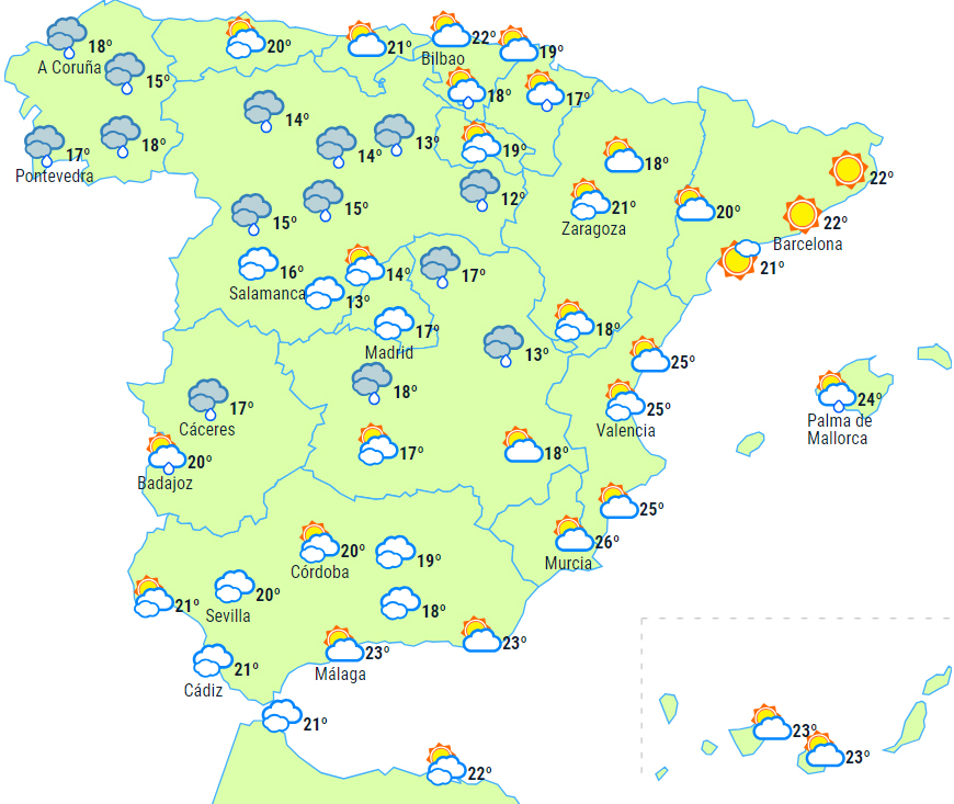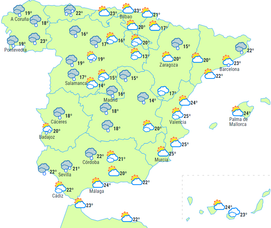 Der forventes flere byger i den vestlige del af Galicien med sandsynlighed for at være vedvarende og/eller kraftige, og hvor de vil blive ledsaget af tordenvejr sidst på dagen. Resterne af frontsystemet, der dagen før krydsede halvøen, vil stadig give nedbør med torden i nordøst såvel som på Balearerne, og det kan lokalt give kraftig nedbør i dele af Catalonien og på øerne i de tidlige timer, men der er dog tendens nogen opklaring senere.
