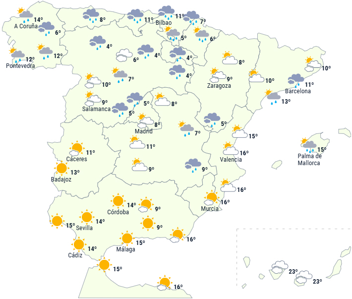 I løbet af dagen vil halvøen og Balearerne forblive under indflydelse af den arktiske luftmasse, som sammen med en Middelhavsfront forventes at give udbredt nedbør til den nordlige halvdel af halvøen og Balearerne, men der kan også komme nogle byger ved Alborán. De vil være kraftigere og mere vedvarende i den østlige del af områderne langs Det Cantabriske Hav og i Pyrenæerne.