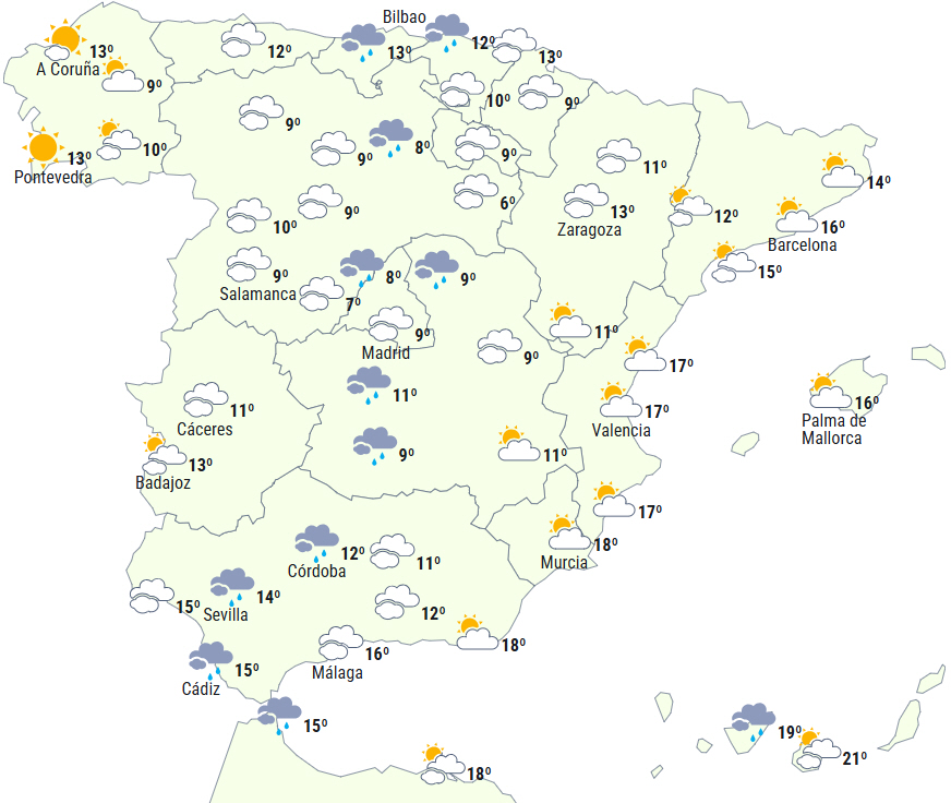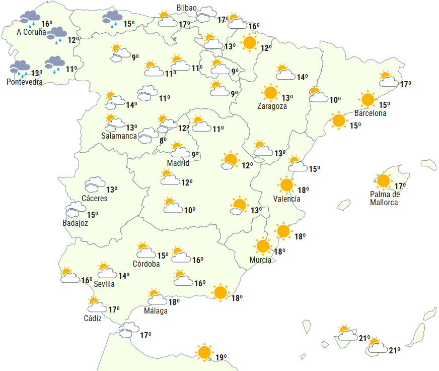 I begyndelsen af dagen vil der være stabilt vejr i størstedelen af landet med overvejende klar himmel eller lavthængende skydække om morgenen, hvilket vil medføre tåge i højlandet, Ebro-dalen og dale i nordøst, Cantabrien og De Baleariske Øer, hvor tågen vil være tættere på Mallorca.