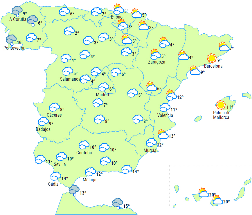 Der forventes svag frost i indlandsområderne på den nordlige halvdel af halvøen og i indlandsområderne i sydøst samt på De Baleariske Øer, hvilket er mere udtalt i bjergene. Tung frost i Pyrenæerne.