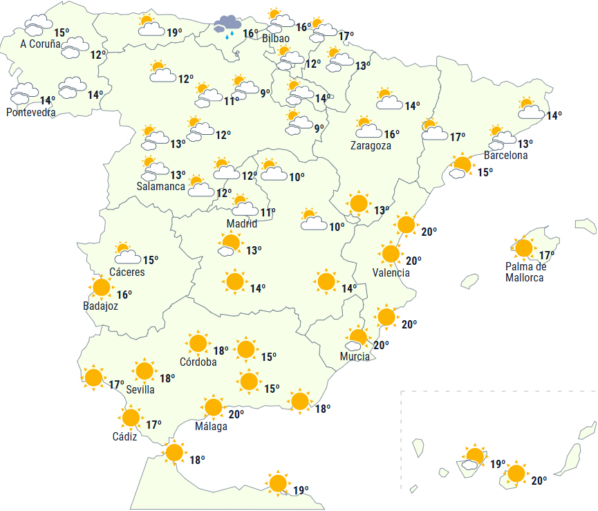 Efter passagen af koldfronten i går bliver der nu etableret et højtryk over halvøen og De Baleariske Øer. Ud over heldagsregnen i Cádizbugten og Gibraltarstrædet får det nordlige af halvøen overvejende overskyet himmel med mulighed for svag og spredt nedbør, mens det forventes at holde tørt på den østlige del af halvøen og Balearerne.