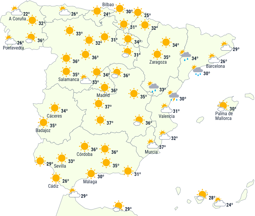 Dagstemperaturerne forbliver som nævnt på 34 til 36 grader i store dele af den sydlige halvdel og endda i indlandsområder i Galicien, det nordlige højland og i Ebro. I disse områder på den sydlige halvdel og langs Middelhavskysten forventes nattemperaturer fortsat ikke at komme under 20 grader.