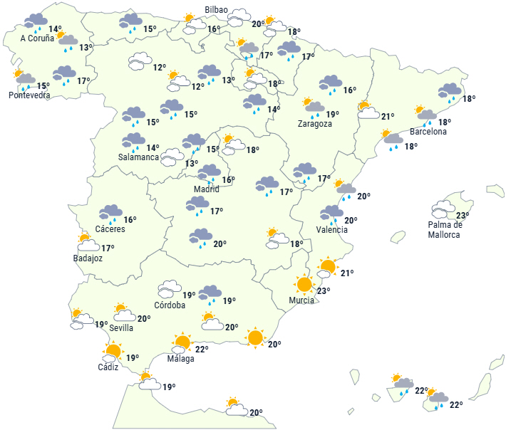 Der forventes skyet himmel og næsten udbredt regn og byger, der dog er svage og spredte i sydvest og mindre sandsynlige i sydøst. Kraftigere byger forventes, lokalt intense og ledsaget af torden, på den nordligste del og på De Baleariske Øer.