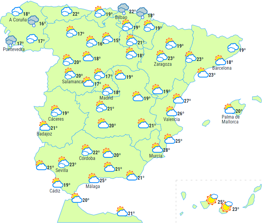 En front trækker hen over halvøen og giver skyet eller overskyet vejr på Atlanterhavssiden med nedbør, som i Galicien og i de vestlige af de centrale bjerge lokalt kan være kraftig eller vedvarende. Skyerne og nedbøren vil i løbet af dagen brede sig fra vest mod øst hen over resten af halvøen, bortset fra det helt sydøstlige område, hvor der ikke forventes regn, men kun lidt overskyet i perioder, samt på Balearerne.