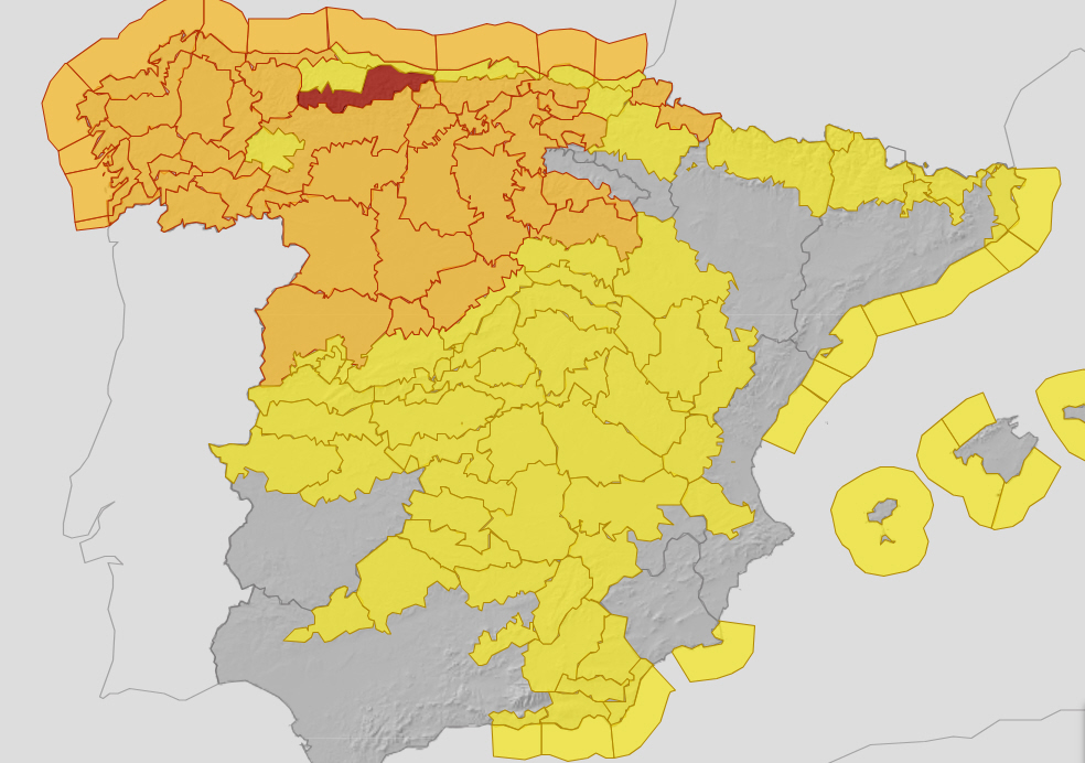 Der advares også om vedvarende og lokalt kraftig nedbør i Galicien, de vestlige af de centrale bjerge og den cantabriske bjergkæde, men det er heller ikke helt udelukket i de vestlige Pyrenæer.