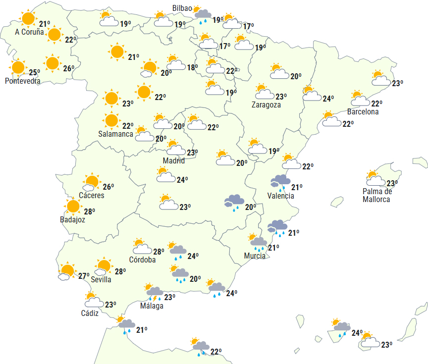 Der vil også være overskyet himmel over den nordlige del af Den Iberiske Halvø med svag nedbør i Cantabrien, den øvre Ebro-dal og det nordlige af De Iberiske Bjerge, mens der generelt vil være overvejende letskyet eller klar himmel i vest.