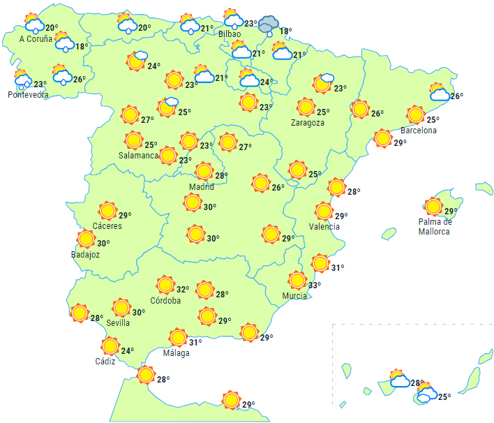Maksimumstemperaturerne vil falde helt i nord og øst samt på Balearerne og stige på De Kanariske Øer og på det meste af Atlanterhavskysten.