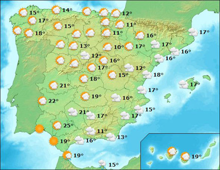 Langs Pyrenærerne bliver det skyet, og der kommer en del nedbør muligvis som sne i højder over 1.200 meter. I resten af landet letskyet og nogen sol, særligt i de østlige egne, mens der kan komme regn i de sydøstlige dele. Málaga, Almería, Granada, Jaén, Ibiza og Formentera er i dag i ”gult” beredskab på grund af udsigt til regn.