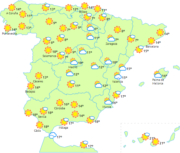 Stabilt vejr til halvøen og Balearerne, men i Middelhavsområderne, Ebro-dalen og det sydøstlige indland forventes der dog overskyet himmel ii hvert fald i perioder med lavtliggende skyer med mulighed for lidt svag og spredt nedbør. Særligt er der chance for nedbør ved Gibraltarstrædet, omkring Valencia og på sydøstkysten.