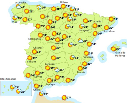 I store dele af Centralspanien og i Sydspanien ligger termometret flere steder og svinger omkring de 40 grader.
