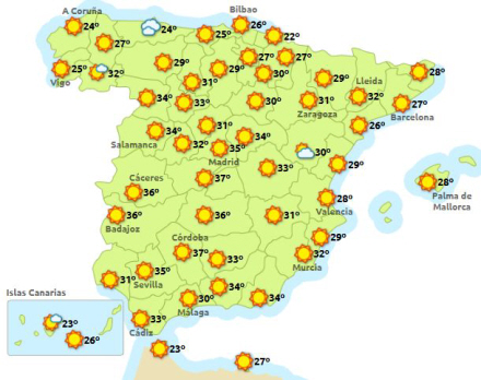 Hedebølgen topper på onsdag med 35 grader i Huelva og Jaén, 36 grader i Madrid, 37 i Sevilla, 38 i Badajoz og Ciudad Real, og 39 i Toledo og Córdoba I yderligere 17 provinser vil temperaturen stige til mere end 30 grader, mens nat-temperaturen kun vil ligge under 20 grader i 19 provinser.