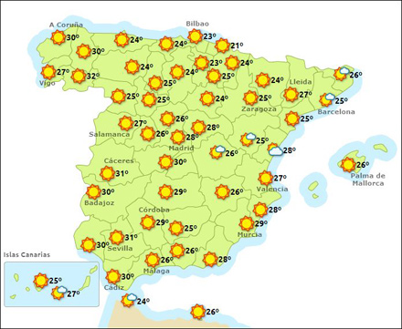 Vejr i Spanien, lørdag kl. 15:00