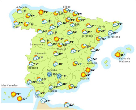 Vejr i Spanien, lørdag kl. 15:00