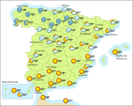 Costa Blanca får hele ugen tørt og ret solrigt vejr. I dag op til 25 grader, let til frisk vind fra fra vest og om natten ned til 18 grader. I morgen formiddag en overgang ret blæsende fra vest, men i løbet af eftermiddagen lægger vinden sig igen. Mellem 20 og 24 grader. Mandag og tirsdag blæsende fra vest og mest skyet men tørt. Onsdag lægger vinden sig, og resten af ugen bliver det mest solrigt og mellem 16 og 22 grader.