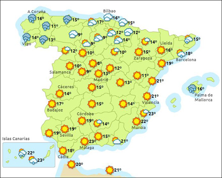 Costa del Sol får atter solrigt vejr i weekenden og ugen derefter. I dag og i morgen op til 23 grader, men om natten bliver det køligere med helt ned til 12 grader og svag vind fra nord. I de næste dage stort set uændret, solrigt og tørt med ret svag vind fra forskellig retning og mellem 14 og 22 grader. Sidst på ugen bliver det koldere, fortsat solrigt og mellem 10 og 20 grader.