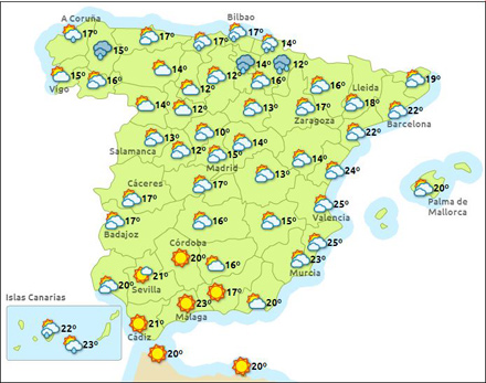 Vejr i Spanien, lørdag kl. 15:00