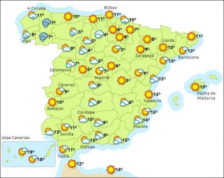 Mallorca og resten af Balearerne får en del sol det mest af ugen. I dag efterhånden nogen opklaring, men kun en smule sol og ret koldt med mellem fem og 14 grader. Søndag solrigt og endnu køligere: om dagen kommer den ikke over 11 grader. Mandag og tirsdag solrigt, onsdag mere skyet og mulighed for lidt regn, torsdag ret blæsende og nogen sol, men fra fredag igen en del sol og tørt.
