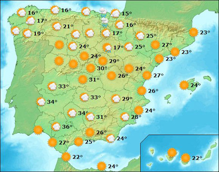 Vejr i Spanien, lørdag kl. 15:00