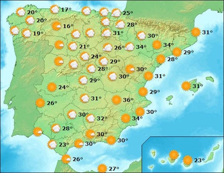 Kold luft fra nordvest banker i weekenden termometret et godt stykke ned, i hvert fald i de vestlige egne, mens den nordøstlige del og Ebro-dalen er ramt af hedebølge med 40 grader.
