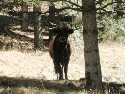 Men tilbage til vores møde med tyren. Første gang vi mødte ham, var den 12. oktober 2010. Vi var på vej ad de "smalle hylder" på vores ATV op mod Maroma; det højeste punkt i det område. På et tidspunkt kører vi ad grusvej gennem en nåleskov. Og så stod han der! Ikke helt fuldvoksen, men alligevel imponerende. Vi havde på det tidspunkt kørt mange ture i dette område, og vi har da ofte set geder, får, heste og en enkelt ko eller to, men ALDRIG en tyr før.
