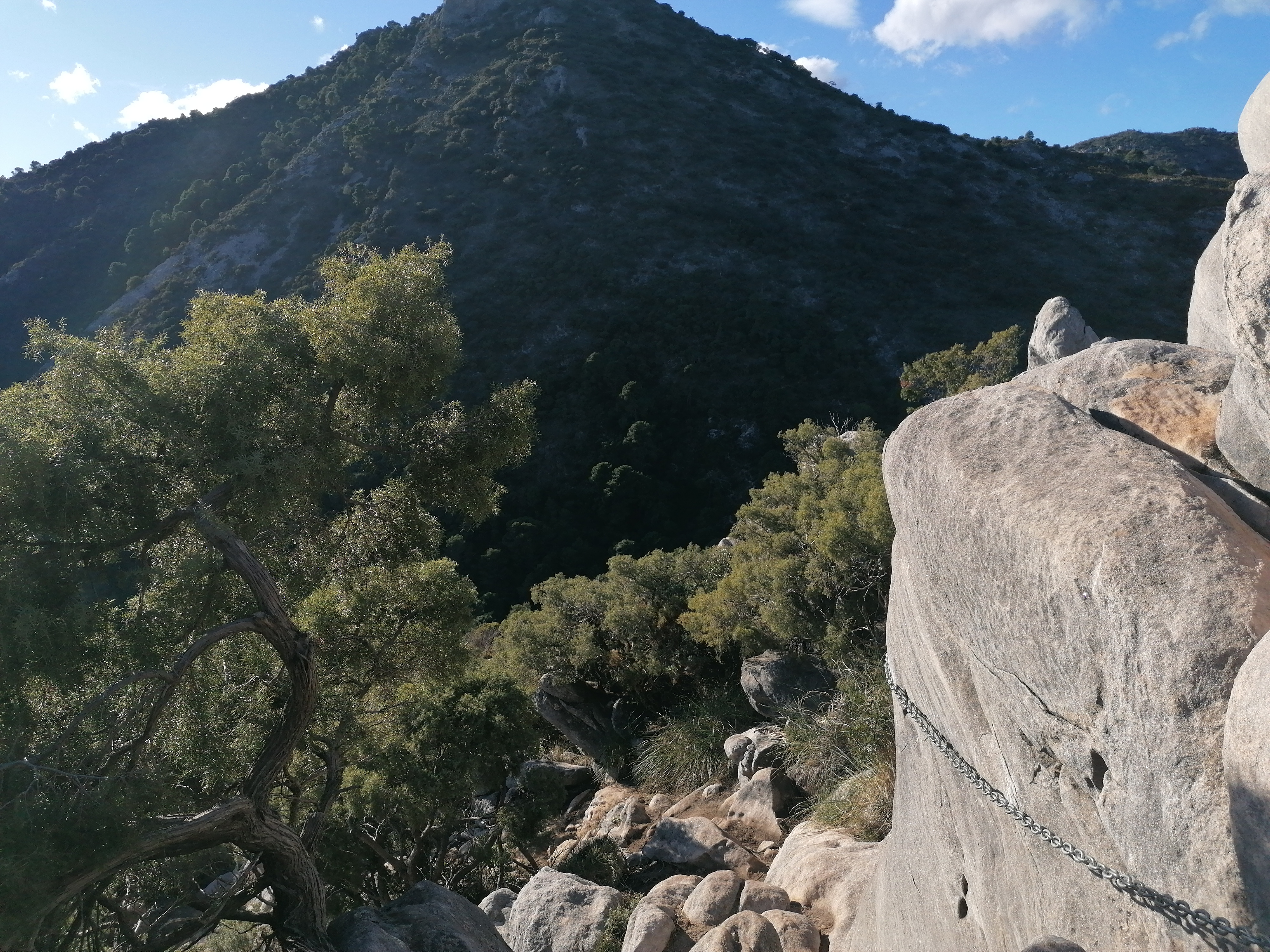 Den første del af ruten går på en behagelig, bred skovvej, men det varer ikke længe, før vi drejer af og fortsætter gennem skoven på en ujævn og mere stenet sti. På den første strækning ser vi bjergene omkring os og den lille bjergby Ojén, men det varer ikke længe, før vi får frit udsyn over hele kysten fra Mijas til Marbella.