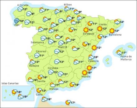 Madrid får i dag efterhånden skyet vejr med mellem to – 13 grader, Barcelona nogen sol og otte – 15 grader, Valencia efterhånden mere skyet og ni – 18 grader, mens Málaga får nogen sol og mellem ti – 19 grader.