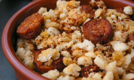 Fortsæt med Migas; en typisk ret med ristede brødterninger, vand, pølser og mørbrad serveret med druer, melon, vandmelon, appelsiner og oliven