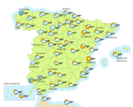 Vejret i Spanien, lørdag klokken 14:00
